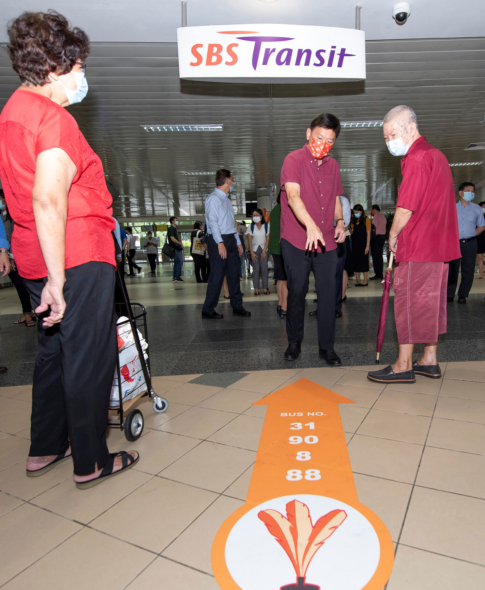 SMS Chee shares with an elderly commuter about how the floor stickers at Toa Payoh Bus Interchange can assist with wayfinding. (Photo: SBS Transit)